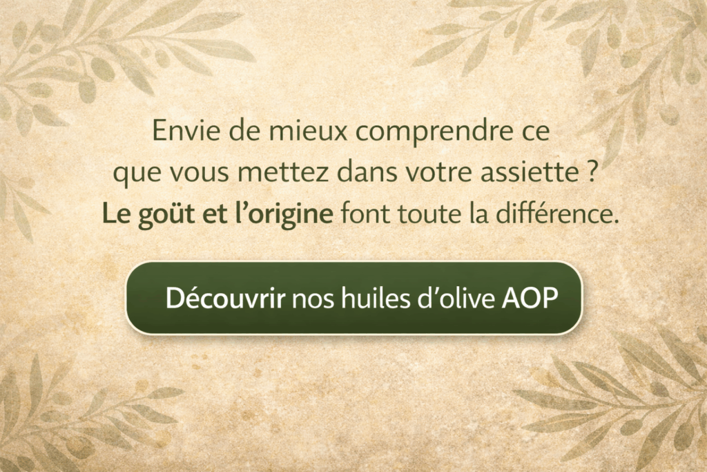 👉 Découvrez nos huiles d’olive AOP et laissez-vous guider par le goût et l’origine.